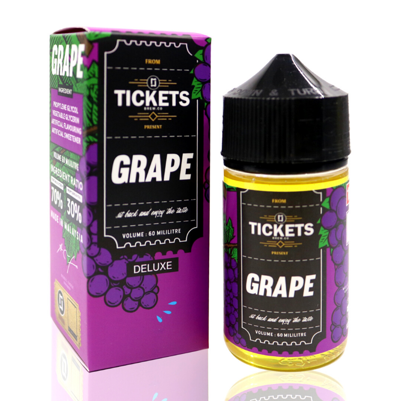 Tickets Deluxe Grape น้ำยาบุหรี่ไฟฟ้าฟรีเบส จากมาเลเซีย กลิ่นองุ่นยอดฮิต หอมหวานกำลังดี ความเย็นปานกลาง